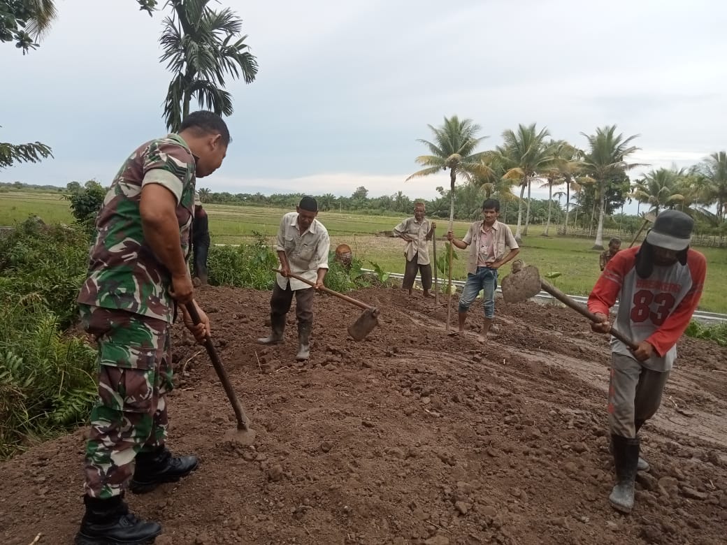 Bersatu Bersama Warga, Babinsa Kodim 0103/Aceh Utara Gotong Royong Timbun Jalan Menuju TPU