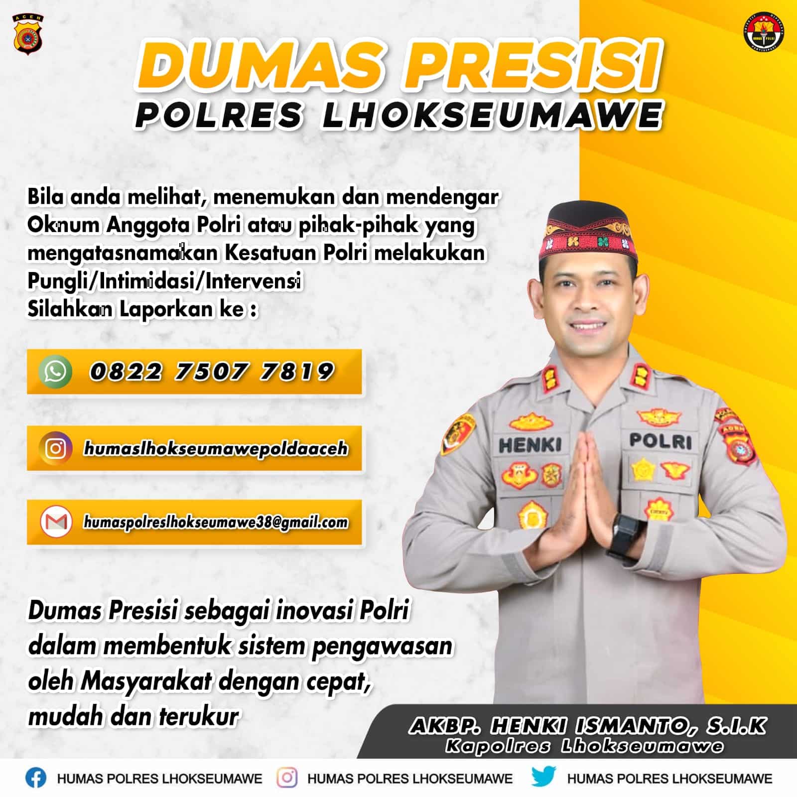 AKBP Henki menekankan pentingnya partisipasi aktif masyarakat dalam memberantas pungli, intimidasi dan intervensi yang dilakukan oleh oknum Polri dalam bertugas dengan melaporkannya ke nomor 082275077819 atau datang langsung ke Mapolres Lhokseumawe dengan melaporkannya kepada Propam Polres Lhokseumawe.