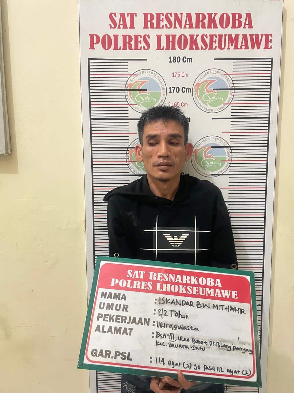 Lanjutnya, Identitas tersangka adalah IT (42 tahun) seorang wiraswasta yang tinggal di Dusun 3 Ulee Buket, Desa Blang Panyang, Kota Lhokseumawe. Sementara barang bukti yang disita termasuk 19 bungkus sabu, sebuah timbangan digital, sebuah ponsel, dan sepeda motor.