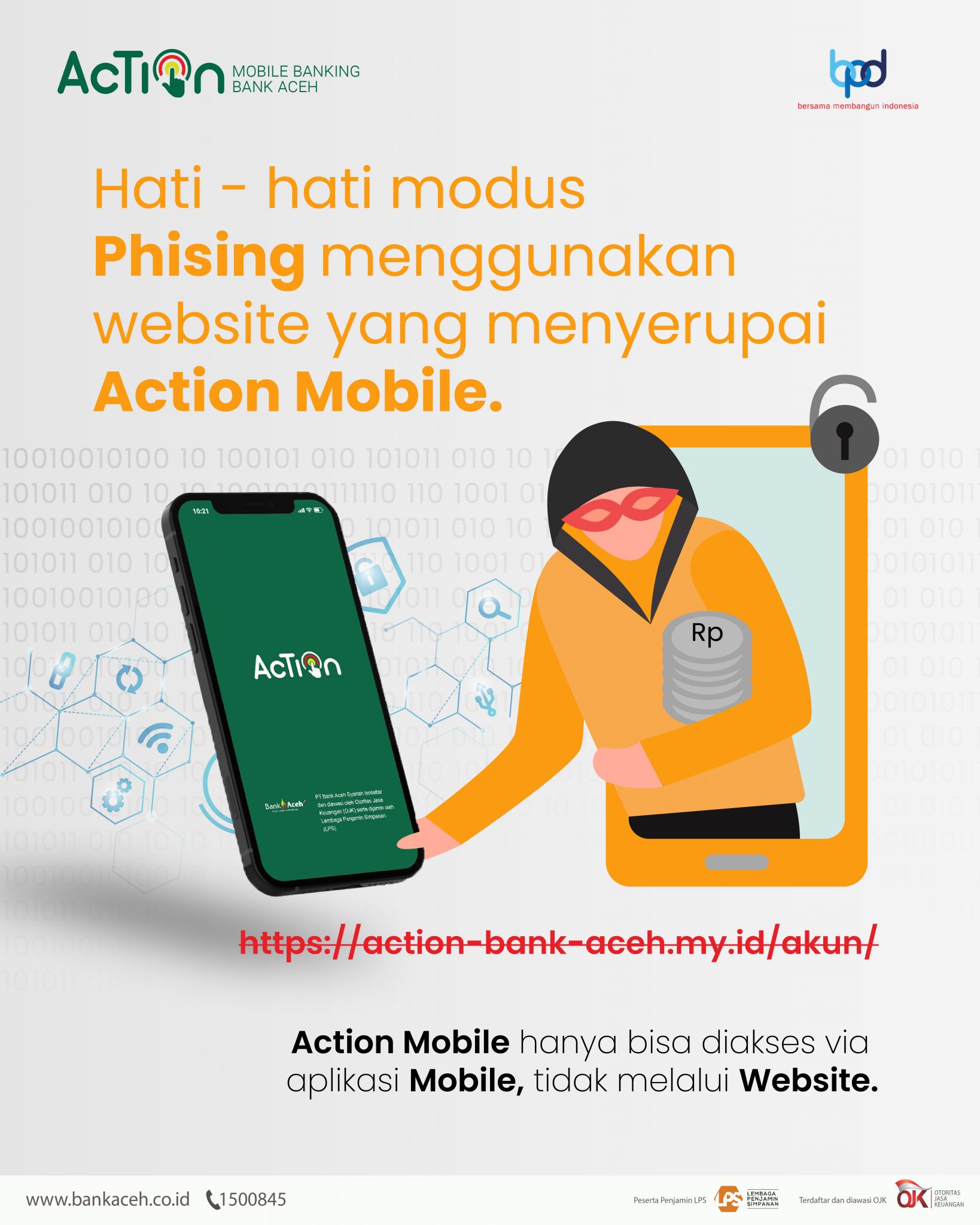 Kabid Humas Bank Aceh, Ziad Farhad mengatakan, dalam sepekan terakhir beredar modus baru penipuan Acion Mobile dengan membuat website yang meniru tampilan Action Mobile dengan iming-iming pendaftaran BI Fast dan fitur transfer dengan biaya Rp.0,-, dengan menggunakan web link https ://action-bank-aceh.my.id/akun.